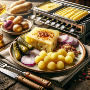 Modern raclette dinners feature a tabletop grill where diners melt slices of cheese in small pans. Accompaniments include boiled potatoes, pickled onions, and gherkins. Raclette is as much about the experience as it is about the food – a leisurely meal that encourages conversation and enjoyment.